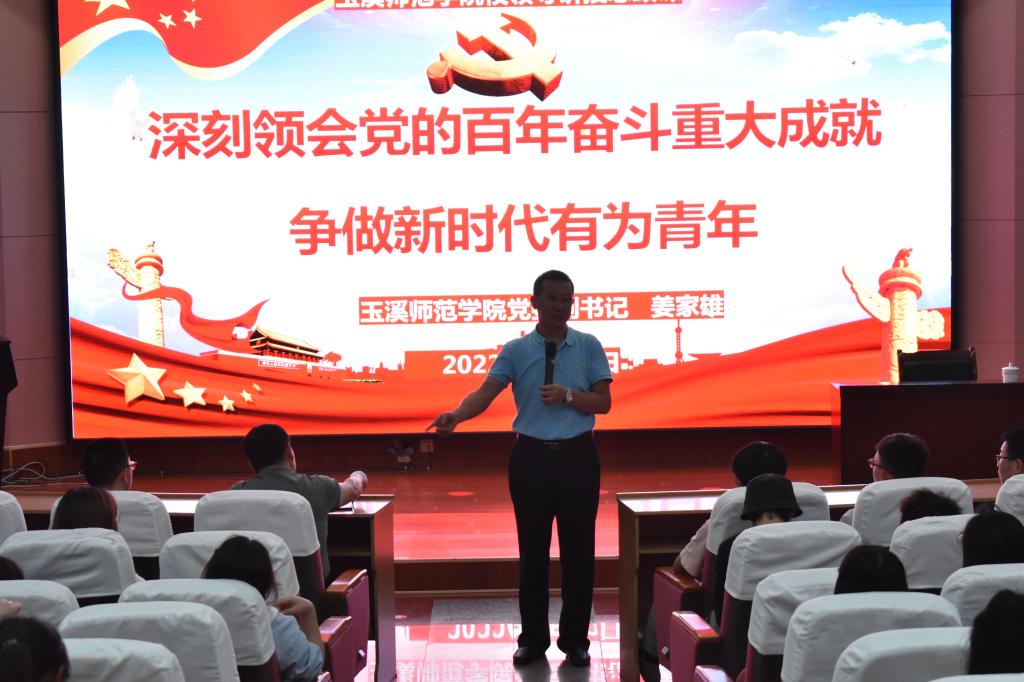 姜家雄同志紧紧围绕着“ 深刻领会党的百年奋斗重大成就,争做新时代有为青年”这一主题,结合党的十九届六中全会通过的《决议》,以身边人讲身边事,以他们成长及奋斗的经历和亲身感悟来展现党的百年奋斗重大成就,教育引导同学们要坚定不移听党话、跟党走,感党恩。