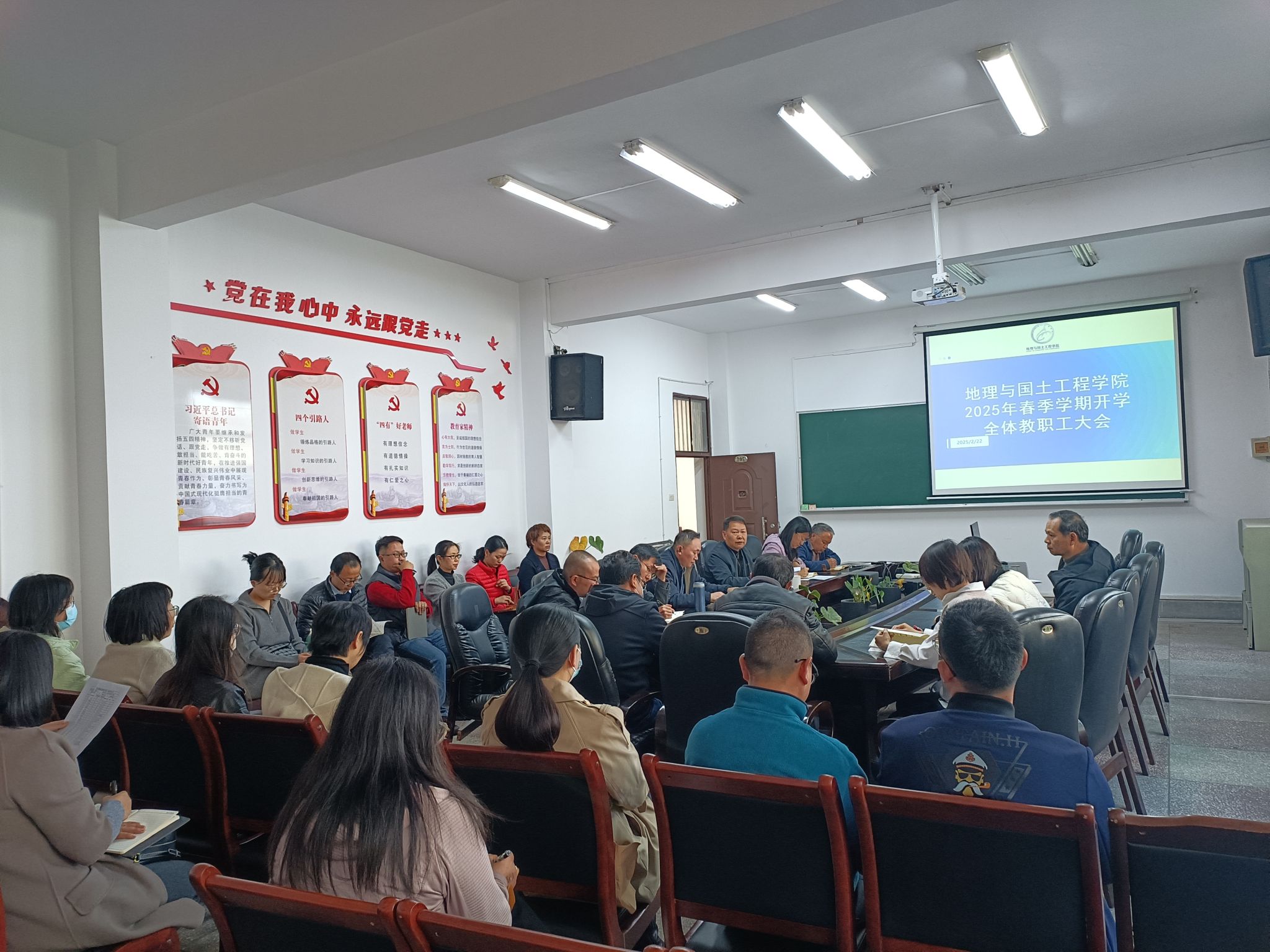 2月22日下午15:00,地理与国土工程学院在五教二楼会议室召开新学期教职工大会暨政治理论学习会、就业工作推进会,会议由书记王寅主持,全院教职工参会。