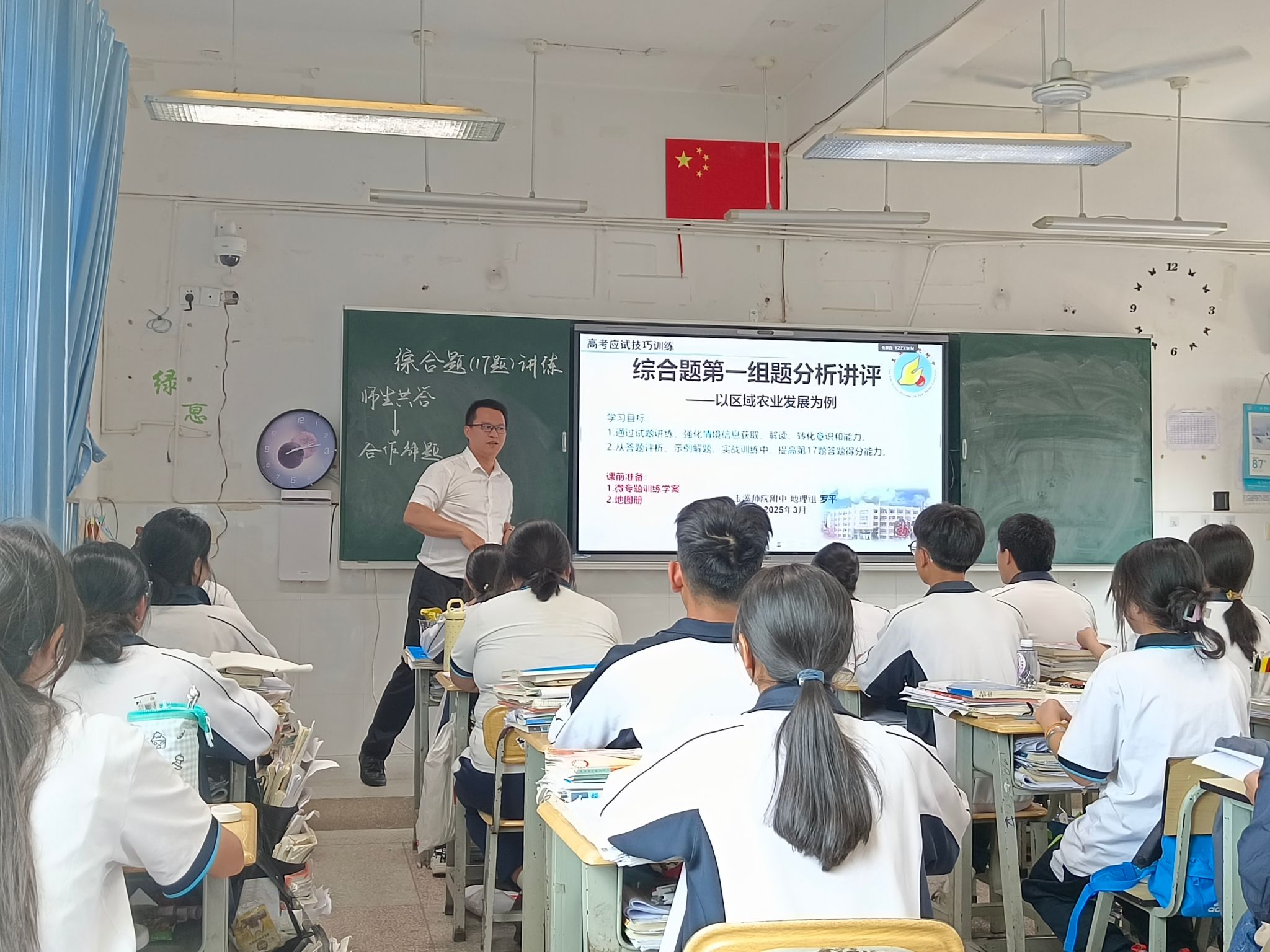 罗平老师讲授“综合题第一组题讲评,以农业区位发展为例”示范课,以扎实的教学基本功、幽默风趣的教学风格,通过薅羊毛趣味导入、小组合作探究开展课堂教学,将新课程理念与方法落实到试题讲评课里,结合学生地理核心素养和基础知识,用地理学思维方法理清解题思路、解题方法与答题策略等,提升学生的解题方法和技巧,给参加教研活动的老师们展示了地理课堂的独特魅力。