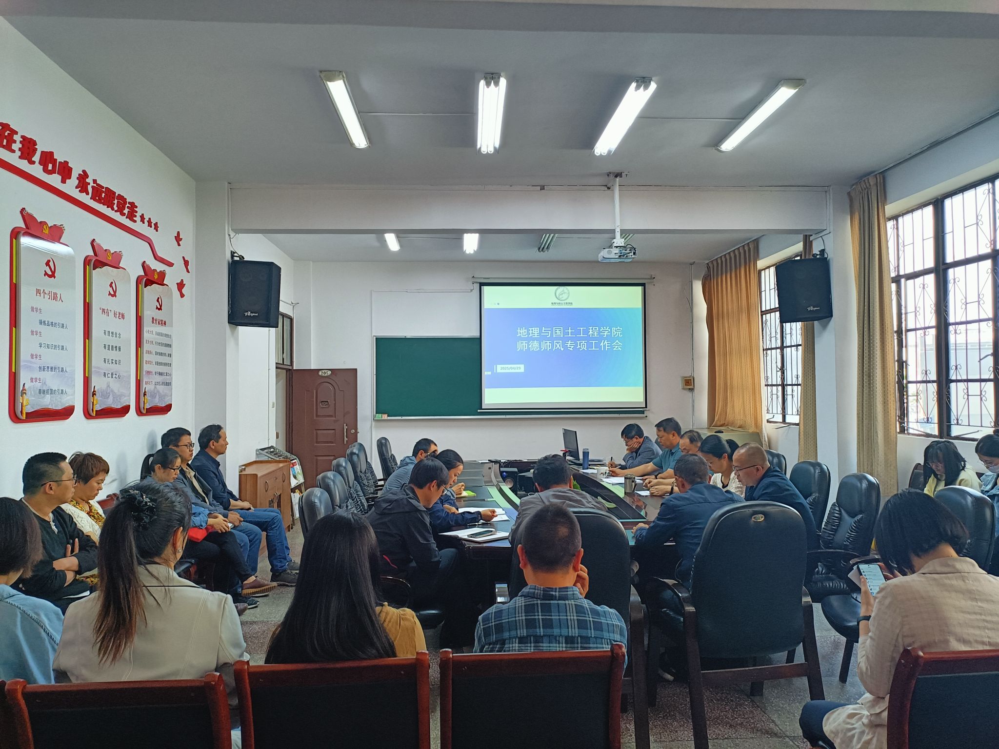 2025年4月29日15:00,地理与国土工程学院在5教205会议室召开师德师风专项工作暨科研诚信教育会,会议由书记王寅主持,全体教职工参会。