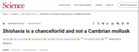 论文信息:J. Yang, W. Li, A.-L. Chen, K.-S. Du, X. Peng, Y. Wang, X.-G. Zhang, M. R. Smith, 2025. Shishania is a chancelloriid and not a Cambrian mollusk. Science. 388,662-664(2025). DOI:10.1126/science.adv463