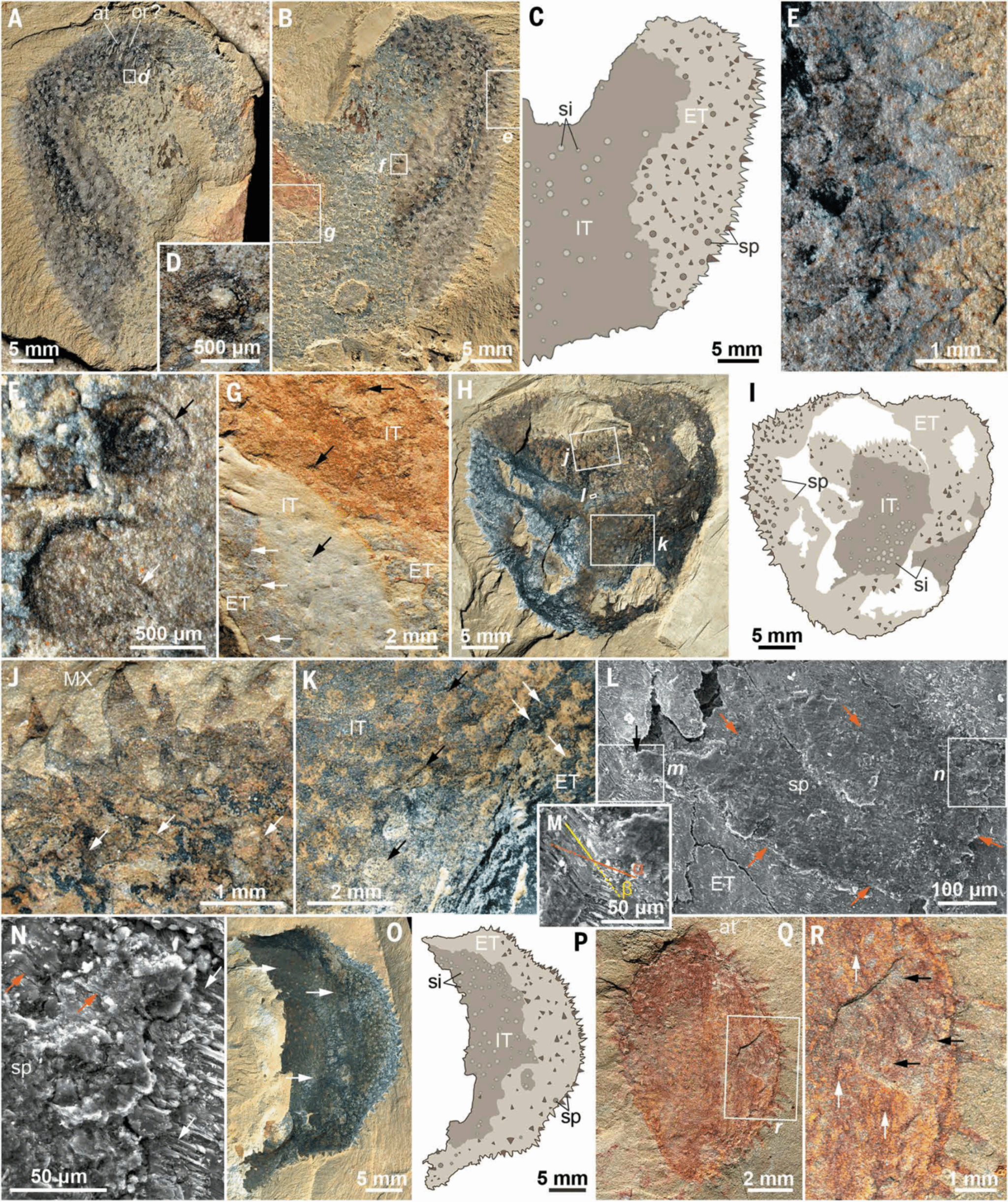 缩写: at, apical tuft(顶须); ET, external body integument(外体壁); IT, internal body scleritome(内体壁骨片系); MX, matrix(基岩); or, orifice(开口); si, spine impressions(骨针印痕); sp, spines(骨针).