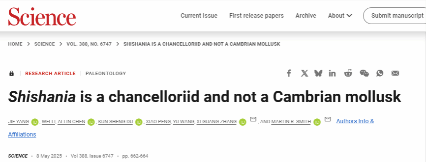 论文信息:J. Yang, W. Li, A.-L. Chen, K.-S. Du, X. Peng, Y. Wang, X.-G. Zhang, M. R. Smith, 2025. Shishania is a chancelloriid and not a Cambrian mollusk. Science. 388,662-664(2025). DOI:10.1126/science.adv463