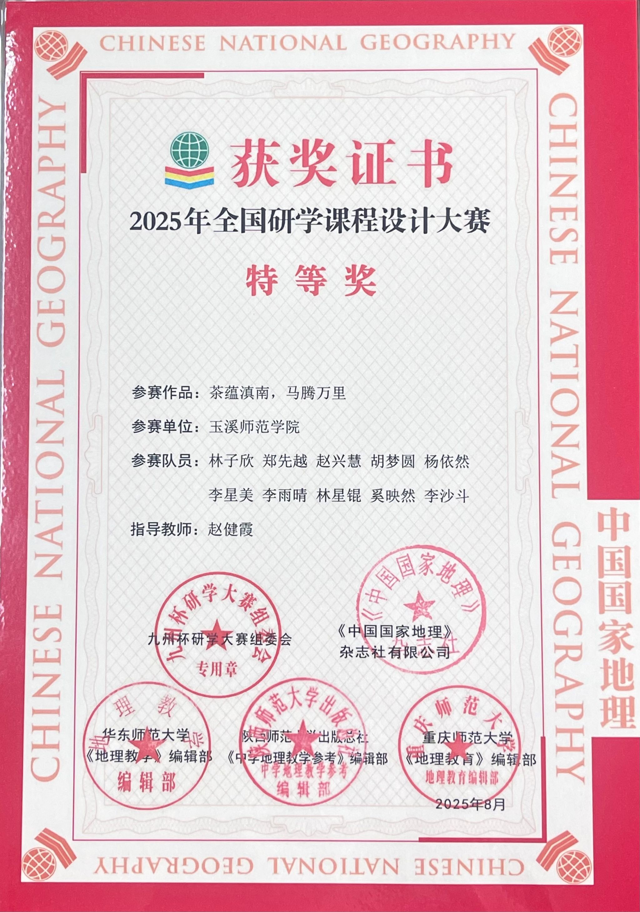 由中国教育学会地理教学专业委员会学术指导、“九州杯”研学大赛组委会,《中国国家地理》《中学地理教学参考》《地理教学》和《地理教育》四刊联合主办的2025年第九届“九州杯”全国研学课程设计大赛线上阶段圆满结束。由地理与国土工程学院地理科学专业多名学生组成的九支参赛队伍在周瑞伍、赵健霞等老师的精心指导下,各参赛队伍提交的课程设计作品兼具科学性、创新性与实践性,荣获特等奖2项,二等奖5项,三等奖2项。