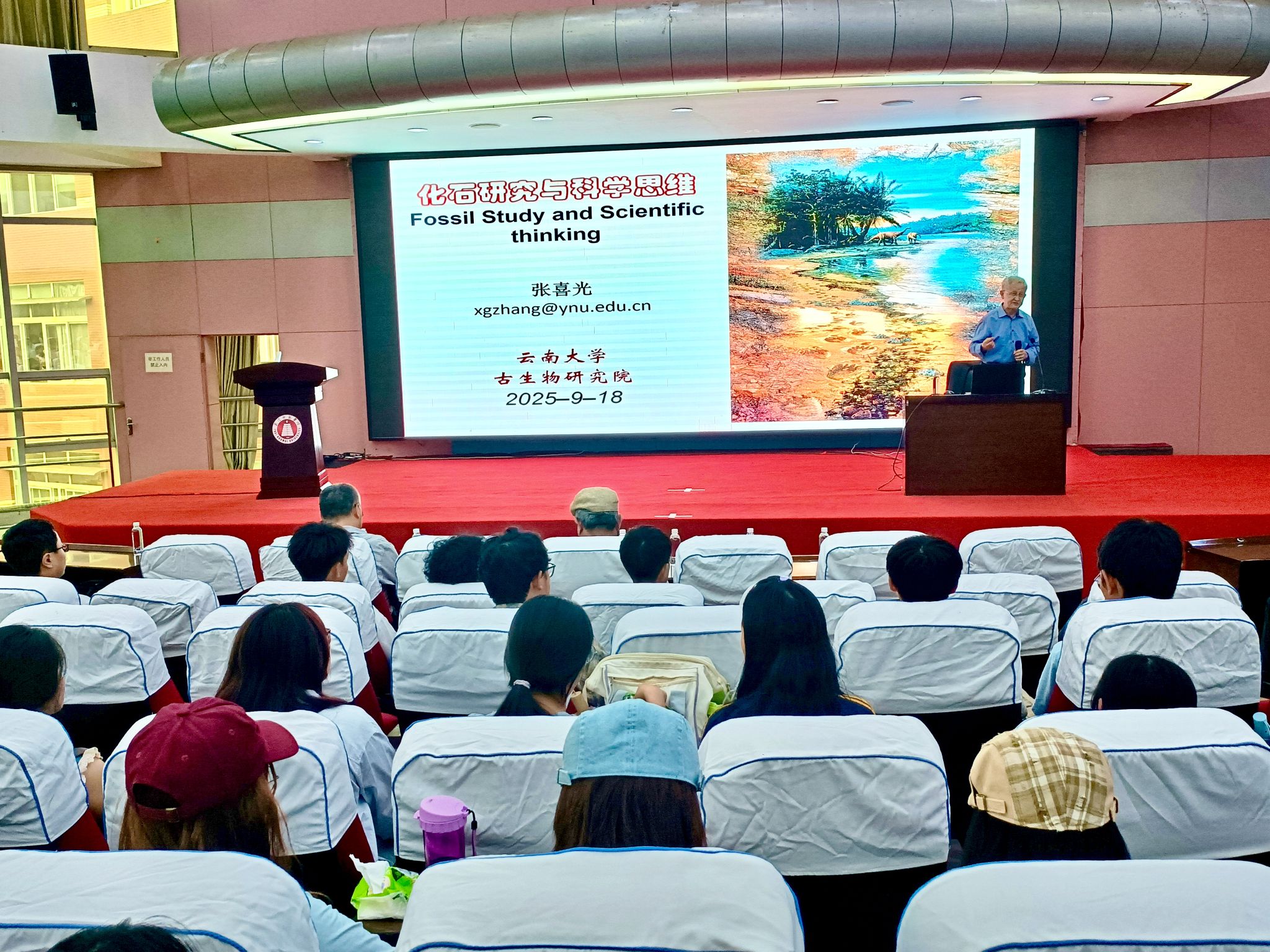 2025年9月18日,云南大学古生物研究院张喜光教授应邀莅临我校,为红塔讲坛带来了一场题为《化石研究与科学思维》的精彩学术讲座。本次讲座吸引了地理与国土工程学院、教师教育学院、农学与生物科学学院、商学院、数理学院、工学院、法学院、美术学院、化学与环境工程学院等师生代表、银龄教师以及玉溪市博物馆同仁共400余人参加。