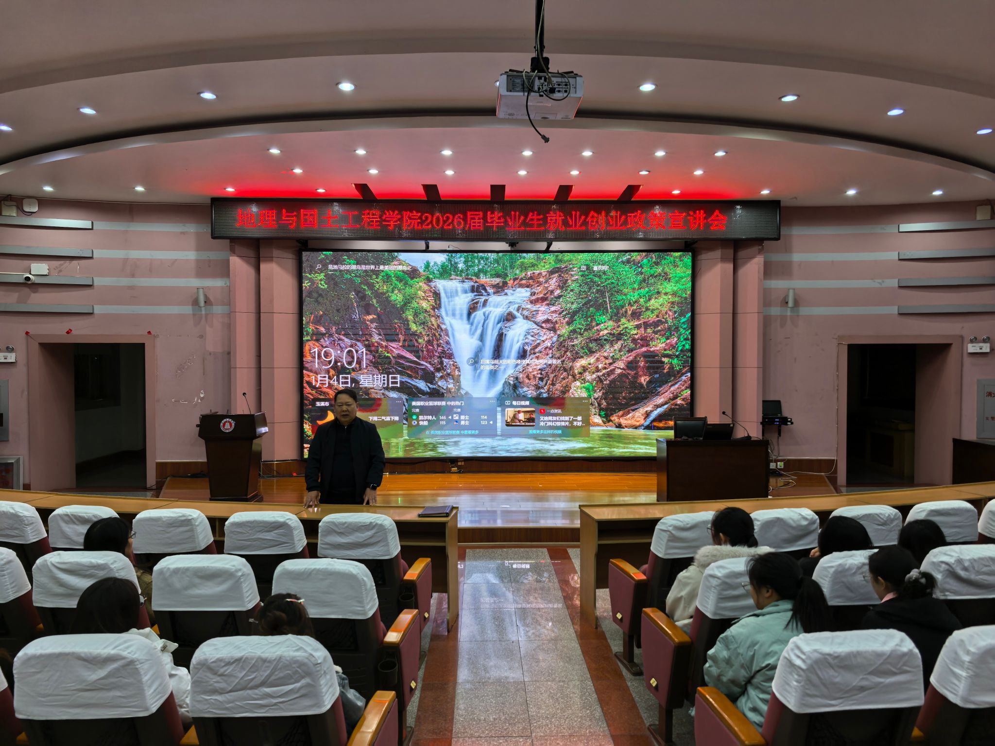 为精准指导毕业生就业创业,2026年1月4日19:00,地理与国土程学院在学校科学讲堂成功举办了2026届毕业生就业创业政策宣讲会。本次宣讲会由地理与国土工程学院党委书记王寅与教师教育学院党委副书记宋树兵联合主讲,为同学们深入解读当前就业形势与政策。