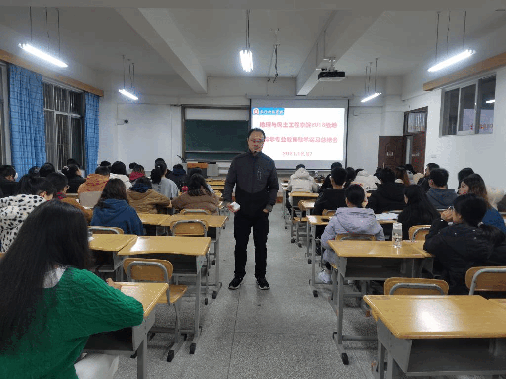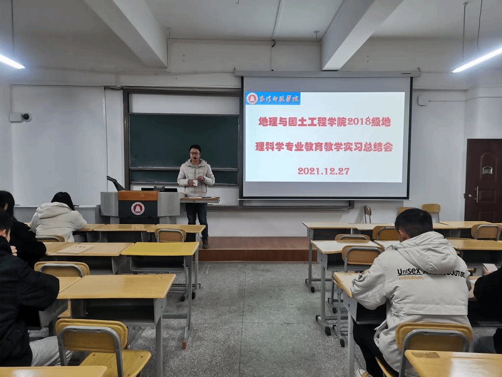 为展示2018级地理科学专业教育实习成果并深化实习生对教师职业的认识,2021年12月27日19:00,学院于11教105室召开了2018级地理科学专业教育教学实习总结会。专业负责人周瑞伍、地理科学一班班主任邱文龙和2018级地理科学专业的全体同学参加会议。