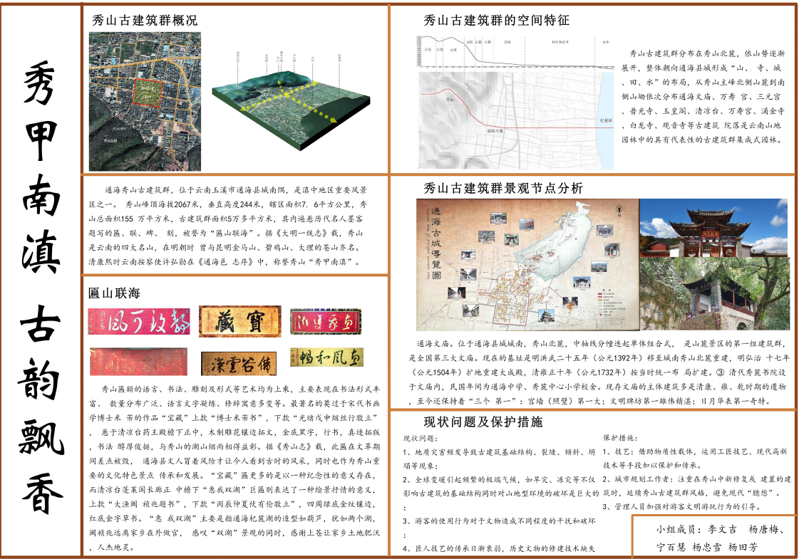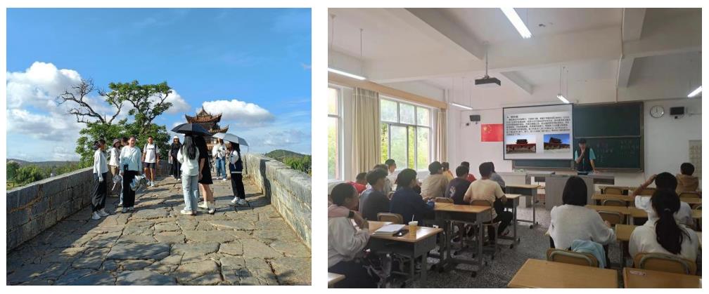 人文地理与城乡规划专业见习设置观察点8个,在城规专业老师的带领下完成。本次见习作为人文地理与城乡规划专业教学实践环节,能够增强学生对己学过的专业基础课的感性认识,初步了解城镇体系规划、城市空间规划的工作性质及野外调查工作的基本程序和方法,通过野外调查、观察、实测,培养学生的实际观察、动手操作能力、独立思考能力和逻辑思维能力。见习四天时间考察通海古城、秀山古建筑群进行实地调研;观察建水清代民居建筑,从建筑单体层面思考传统建筑使用功能,并探讨古城历史街区内群体建筑保护与更新方法;考察了东风韵小镇创意园区、太平湖森林公园小镇,分析云南特色文化创意小镇的空间布局规划特色和开发建设模式等。