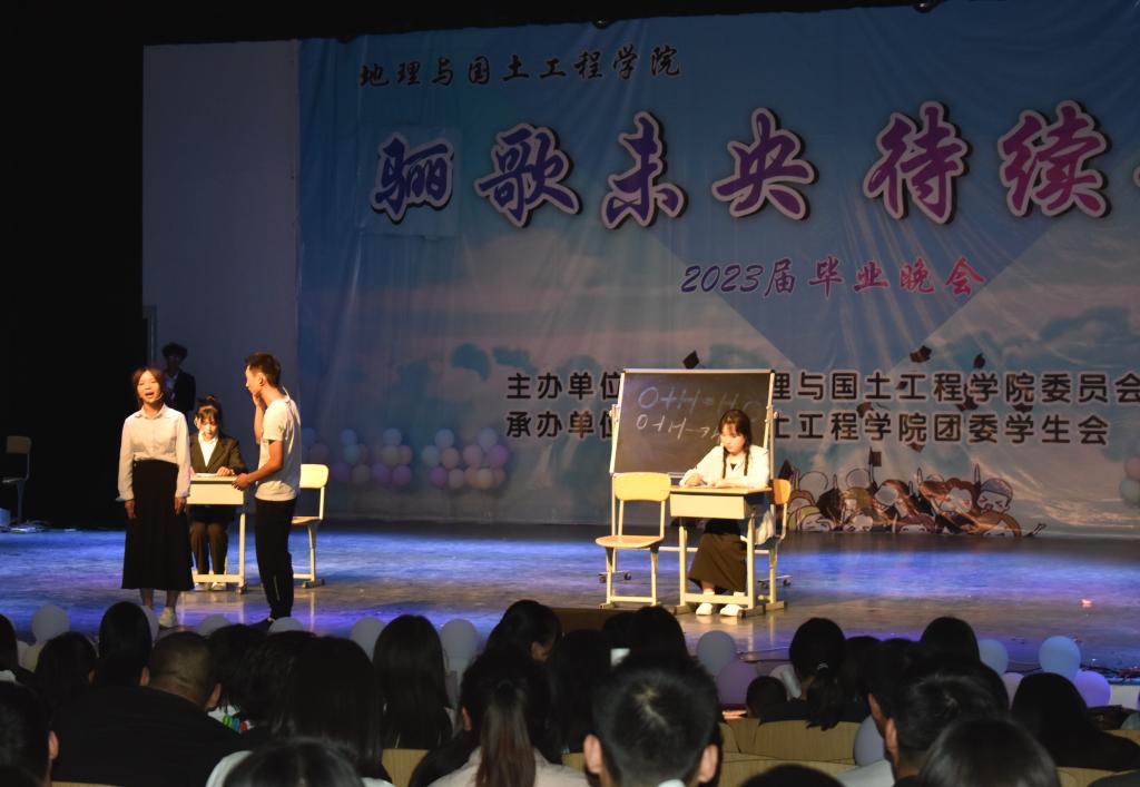 又是一年花草香,又是一年离别意。光阴荏苒,时光在指缝间悄然而逝,四年前怀揣着青春之志的同学们,此时即将完成学业,走向另一段全新的征程。为表达对毕业学子的深深祝福,为送别毕业学子,地理与国土工程学院于2023年5月19日19:00在人文讲堂举办了主题为“骊歌未央,再续华章”的毕业晚会。本次晚会很荣幸邀请到学院领导、老师,大四的毕业生代表以及其他二级学院同学参加。