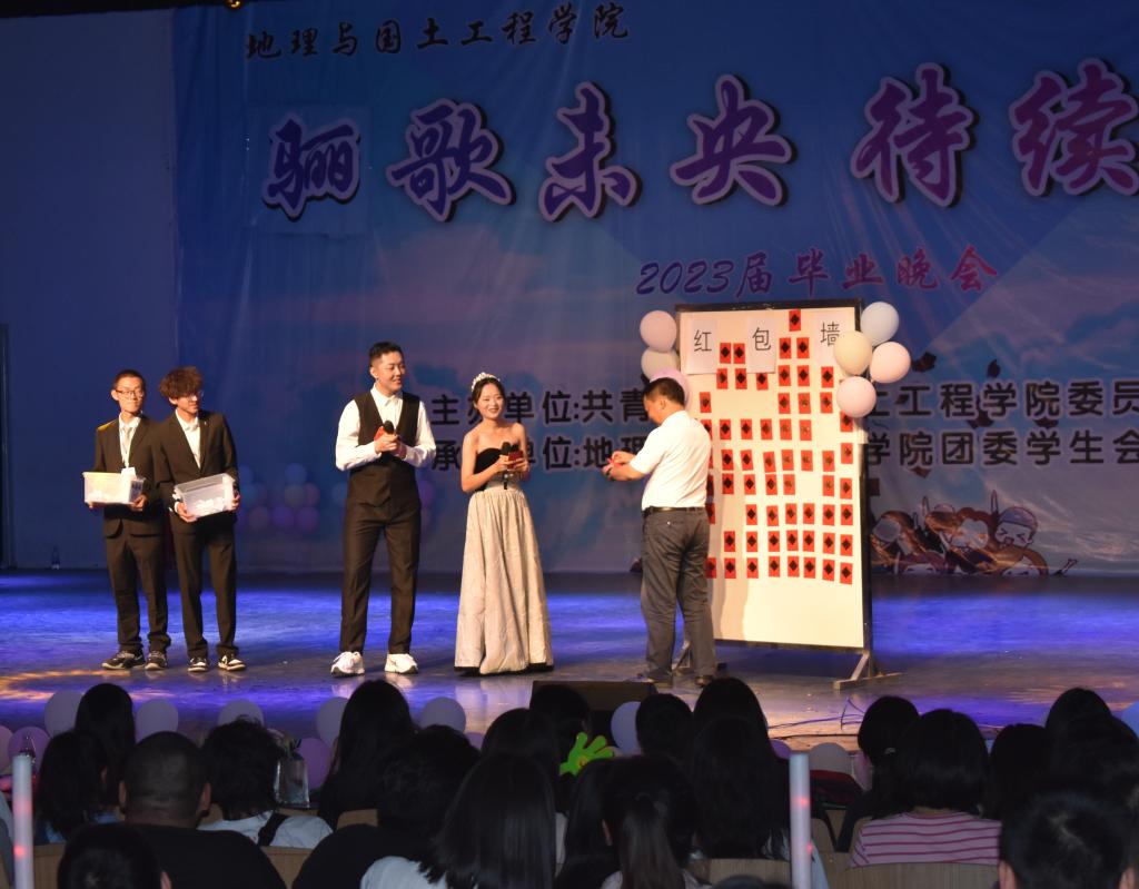 地理与国土工程学院团委学生会精心安排了此次晚会的流程,并在流程上有了大胆的创新,安排了抽红包的环节,大大调动了现场同学们的热情,晚会现场还进行了现场直播,为不能来参加晚会的同学们弥补了遗憾,并且也安排了线上的的抢红包环节,