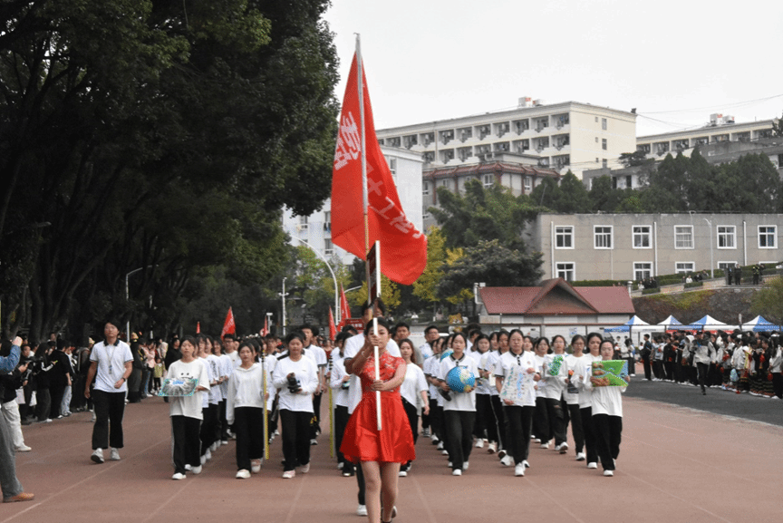 随后,各学院代表队方阵及教职工代表队方阵依次进行了精彩的展演。他们身着统一的服装,步伐整齐,口号响亮,充分展示了玉溪师范学院师生的精神风貌和青春活力。现场掌声雷动,喝彩连连,气氛热烈而欢快。