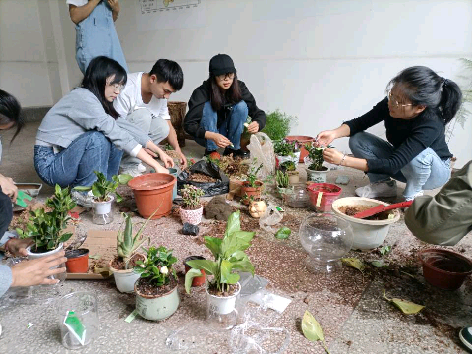本次活动分为两部分:首先,会长介绍哪些花植是土植,哪些是水植,并讲解了各花植栽种注意事项;随后,大家一起动手,合理分配,互相帮助,在种植完成以后,大家一起打扫教室,收拾工具;最后,分配人员将种好的盆栽送回原办公室,并在每周安排两个社团干事带领社团部分成员对这些盆栽进行查看,及时更换。