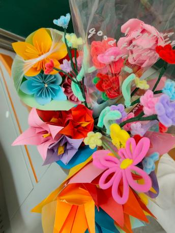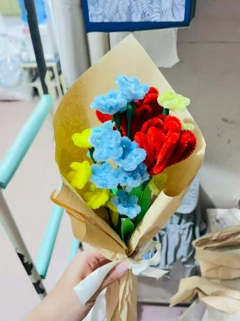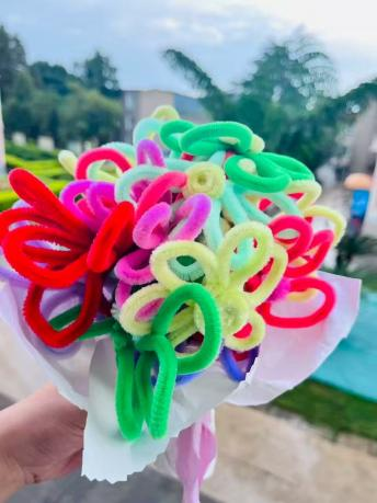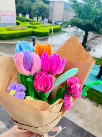 经过一个多小时的精心制作,一根根普通的扭扭棒在大家的巧手下华丽变身,成为一束束独具匠心、栩栩如生的创意花卉作品。学员们捧着自己亲手制作的花朵,脸上洋溢着满足和喜悦的笑容。这些作品虽非真花,却同样绽放出绚丽的色彩,凝聚了制作者的巧思与情感。