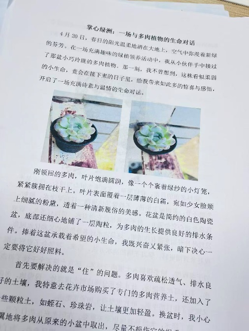 活动以“撰写植物养护日记、分享亲身养护经验”为核心内容,分为报名、稿件提交与作品评定三个阶段。在分享环节中,同学们围绕多肉、绿萝、月季、兰花等具体植物的养护实践,执笔记录下自己与植物相处的点点滴滴。有的同学讲述了与植物“初遇”的温馨故事,有的细致记录了换盆、施肥、防治病虫害等关键节点,还有的同学分享了自己领养种草娃娃的生长历程,展现出对植物生命的尊重与热爱。